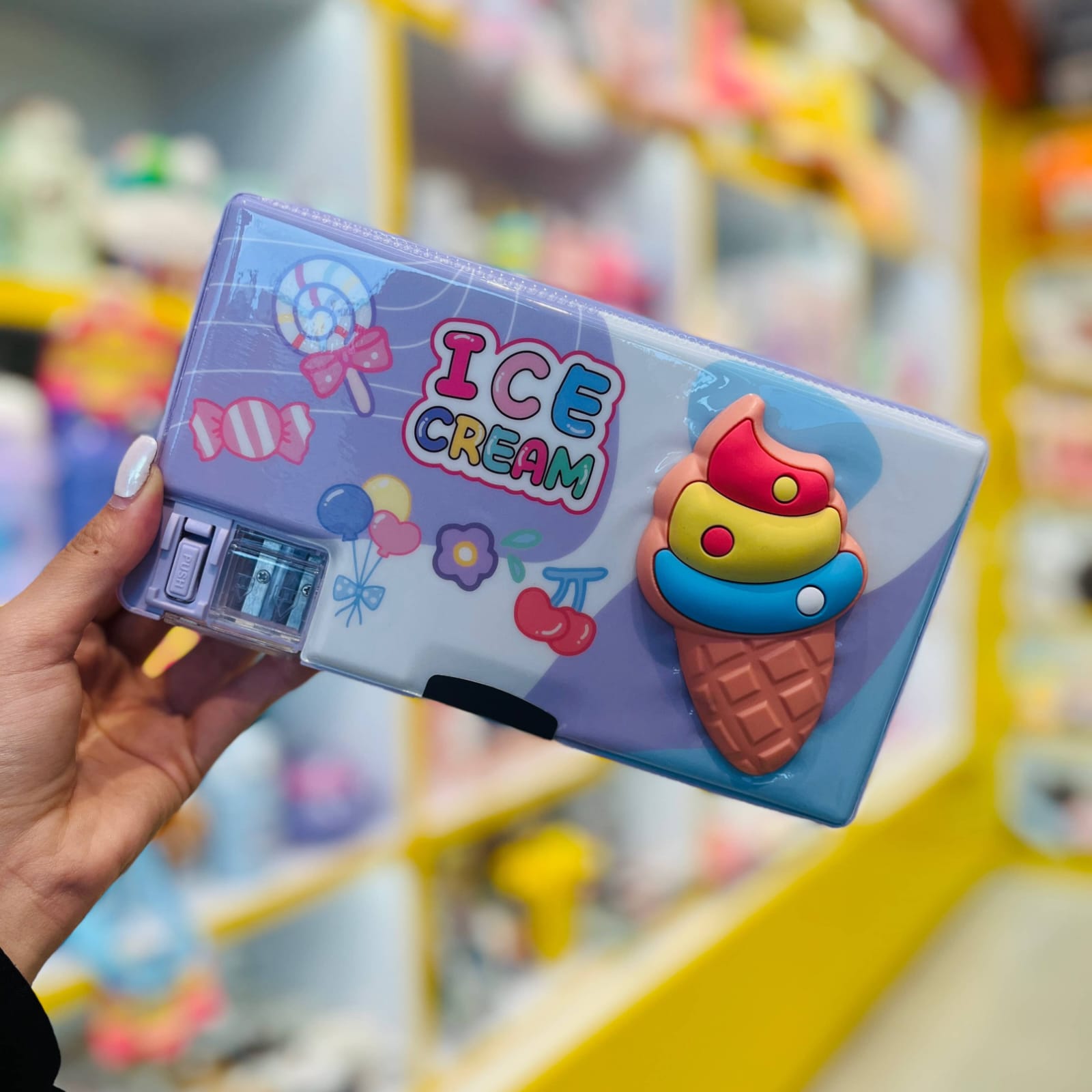The exterior of the pencil box features an eye-catching 3D ice-cream squishy toy, making it an instant favorite for kids. Its dual purpose as both, a pencil box and a sharpener, adds a touch of practicality to its charm. The front of the box is adorned with vibrant candy printing, creating a sweet and playful ambiance.