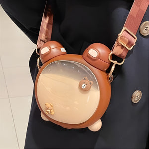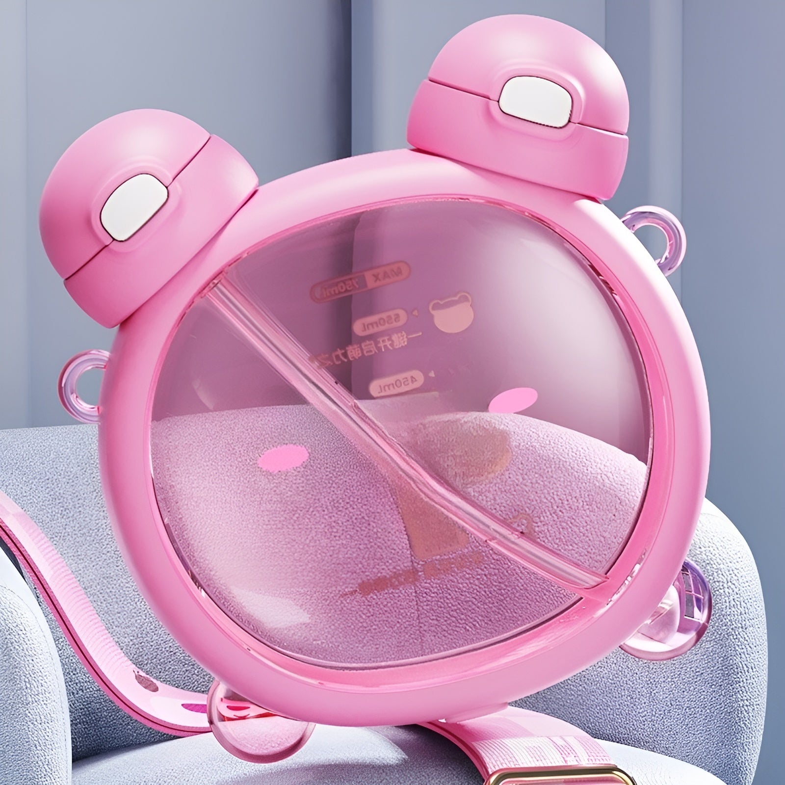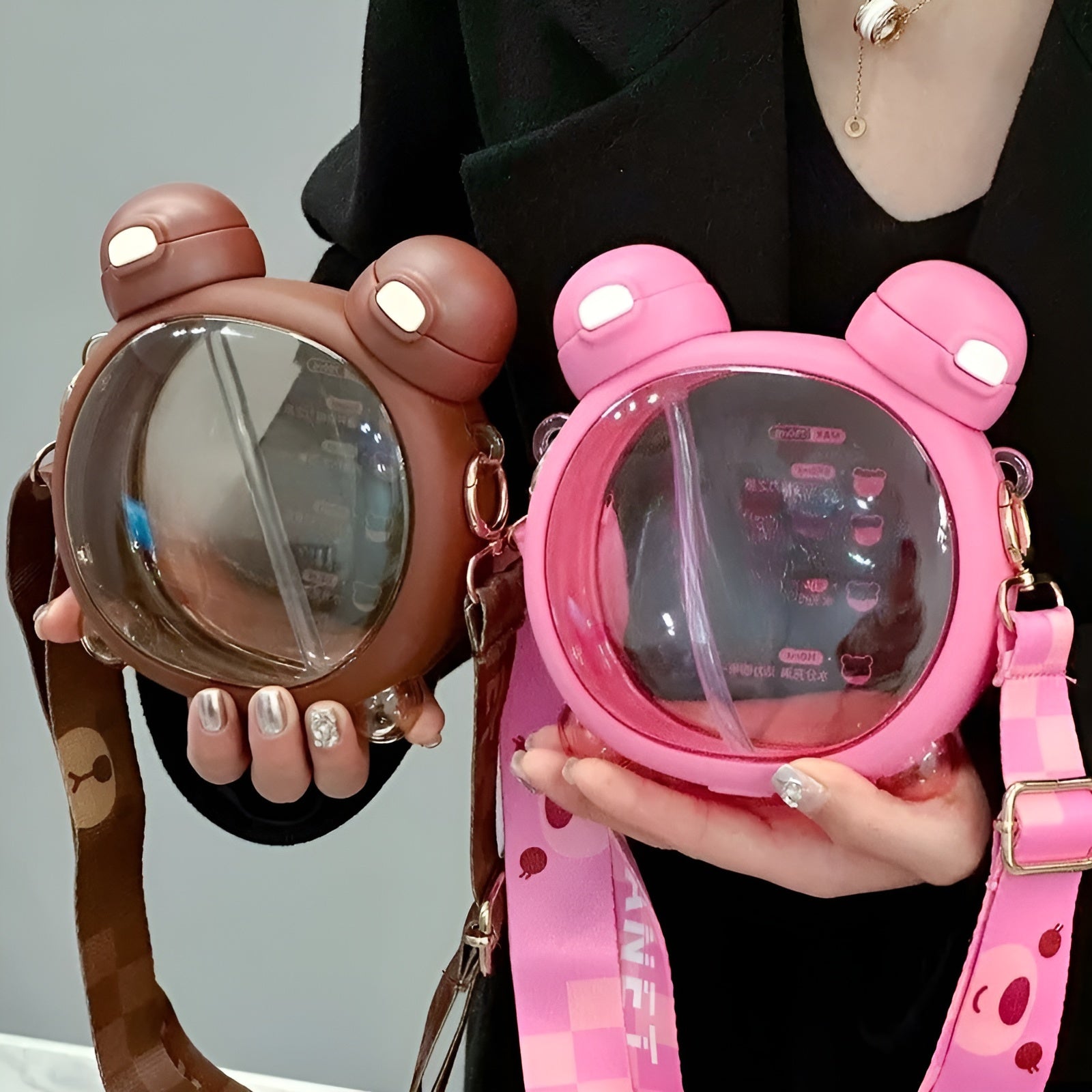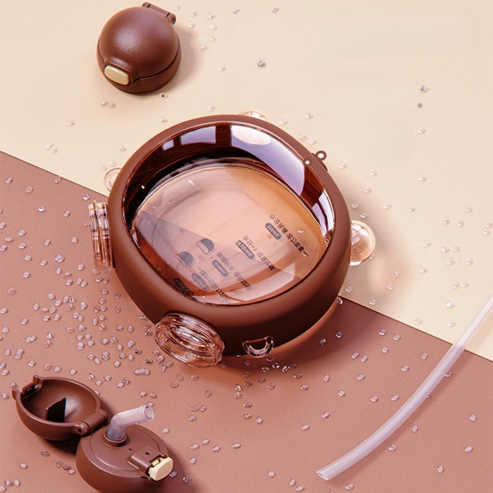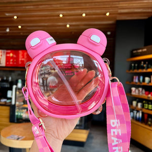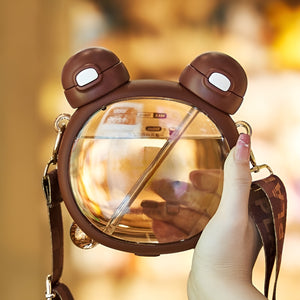 Crafted with convenience in mind, this bottle is equipped with a detachable strap allowing you to carry it around as preferred, attaching it to your bag or hanging on your shoulder, ensuring you always have your hydration buddy by your side. The inclusion of a straw makes sipping from the bottle effortless, providing a convenient and enjoyable drinking experience. The bottle itself features a clever design with a glass in the middle, allowing you to see the liquid inside from both sides. This unique feature adds a touch of sophistication and makes it a conversation starter. Whether you choose to fill it with water, juice or any other refreshing beverage, the Bear Face Dual Bottle will be a stylish and practical choice.