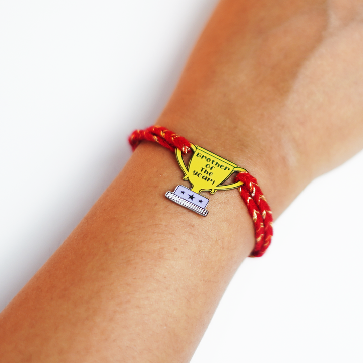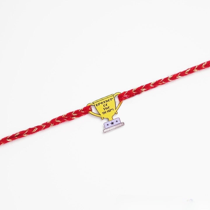 Celebrate your amazing brother with our one-of-a-kind "Brother of the Year" Rakhi! This unique design features a red thread and comes with a well-deserving trophy to show your appreciation on Raksha Bandhan. Adorned with the words 'Brother of the Year,' it's the perfect way to tell him just how special he is. Order this exclusive Rakhi online from our gifting store, TinyMinyMo and enjoy doorstep delivery to make this occasion even more memorable.