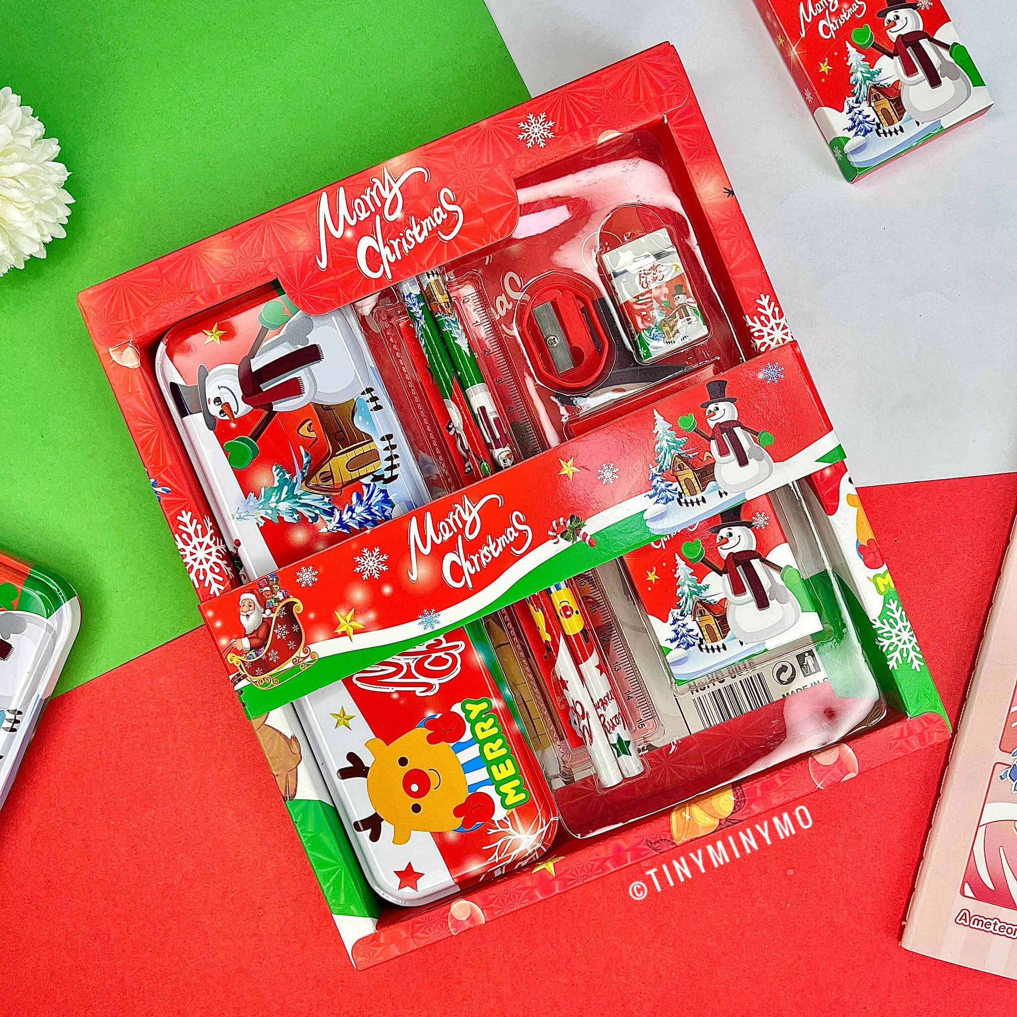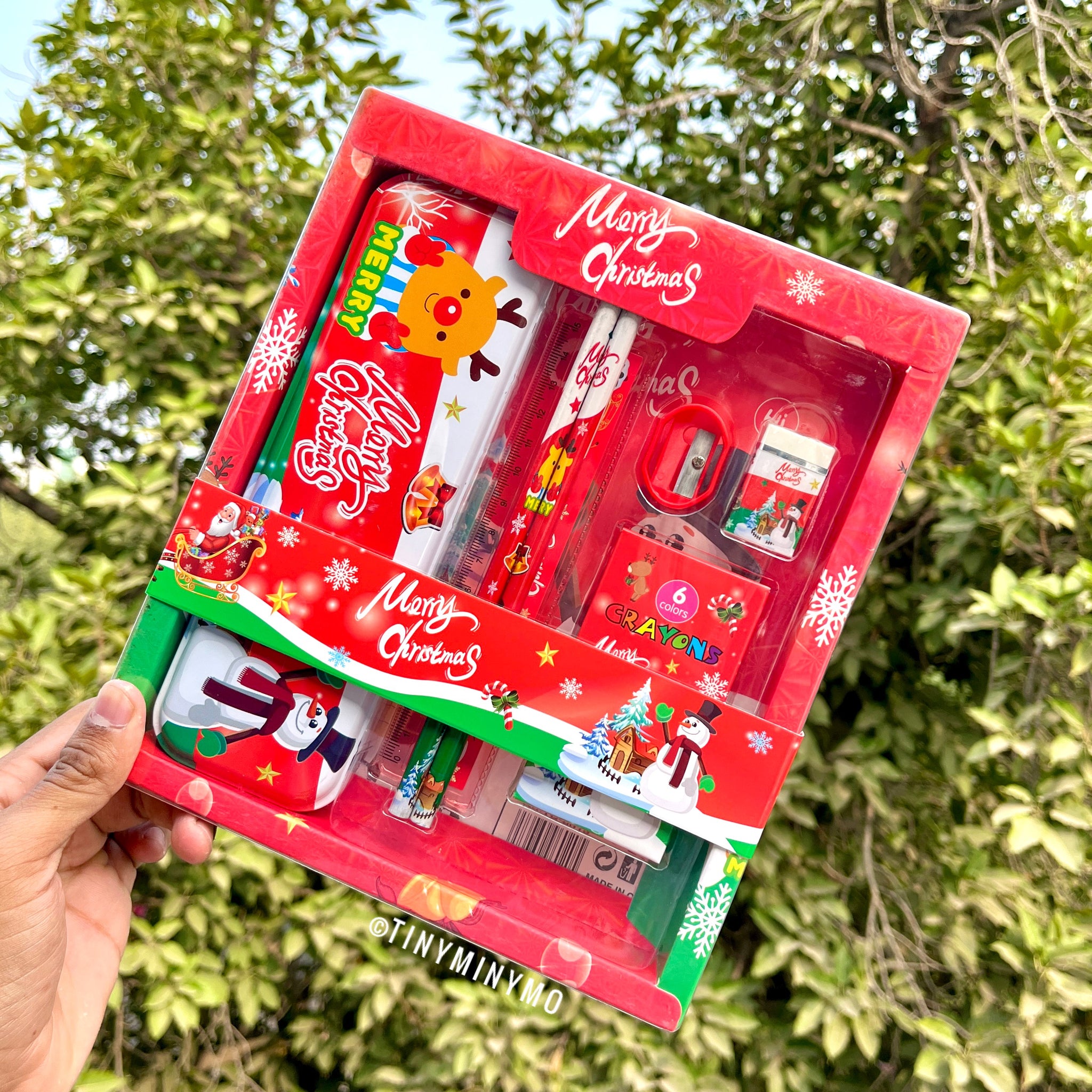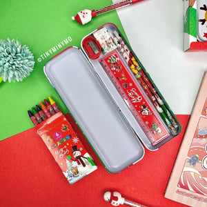 The set includes a variety of essential stationery items, such as a pencil box, pencils, an eraser, a sharpener, a scale and a box of crayons. Perfect for both school and festive crafts. These items are all designed with vibrant Christmas-themed colors and graphics. The pencil box keeps everything neatly organised, while the crayons allow for a burst of creativity, making it fun to draw, color and create new art during the holiday season.
