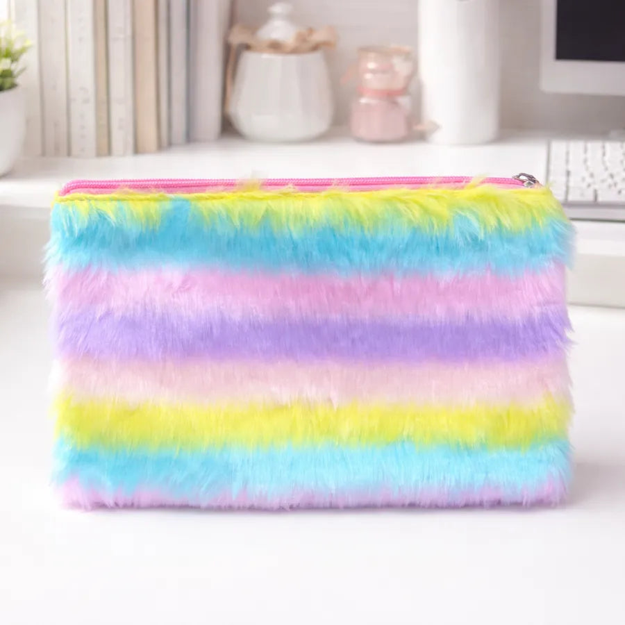 The smooth zipper closure keeps everything secure, while the soft plush finish adds a cosy, trendy touch that stands out from ordinary pouches.