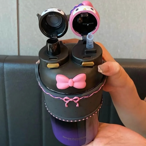 This Sanrio Insulated Dual Bottle is an absolute visual delight, combining cuteness and functionality in one loving package. The bottle comes in two color variants - Black and White. Each bottle features two closures, topped with adorable 3D figurines of beloved Sanrio characters - My Melody and Kuromi — each styled with cute bows in coordinating colors. The body of the bottle is adorned with delicate ribbon detailing and a large 3D bow at the center of the bottle's cap, giving it a sweet and elegant look. The bottle exudes a premium, collectible feel. Perfect for drinking in two different ways at once, this dual bottle is a must-have for Sanrio fans who love to stay stylish on the go.