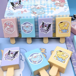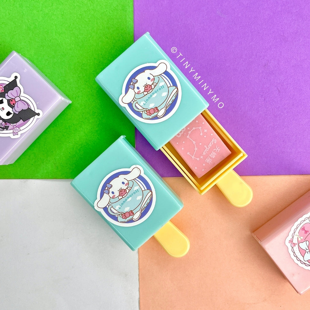 Add a dash of cuteness and fun to your stationery collection with the Sanrio Magic Erasers, featuring four lovable variants of Sanrio characters: Cinnamoroll, My Melody, Kuromi and Pompompurin. Each eraser comes in a lovely popsicle-shaped container with a convenient sliding mechanism, making them not only practical but also lovely collectibles. These high-quality, non-toxic rubber erasers are perfect for school or office use, erasing pencil marks with ease while adding a touch of magic to your desk setup.