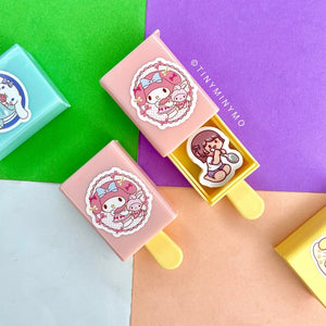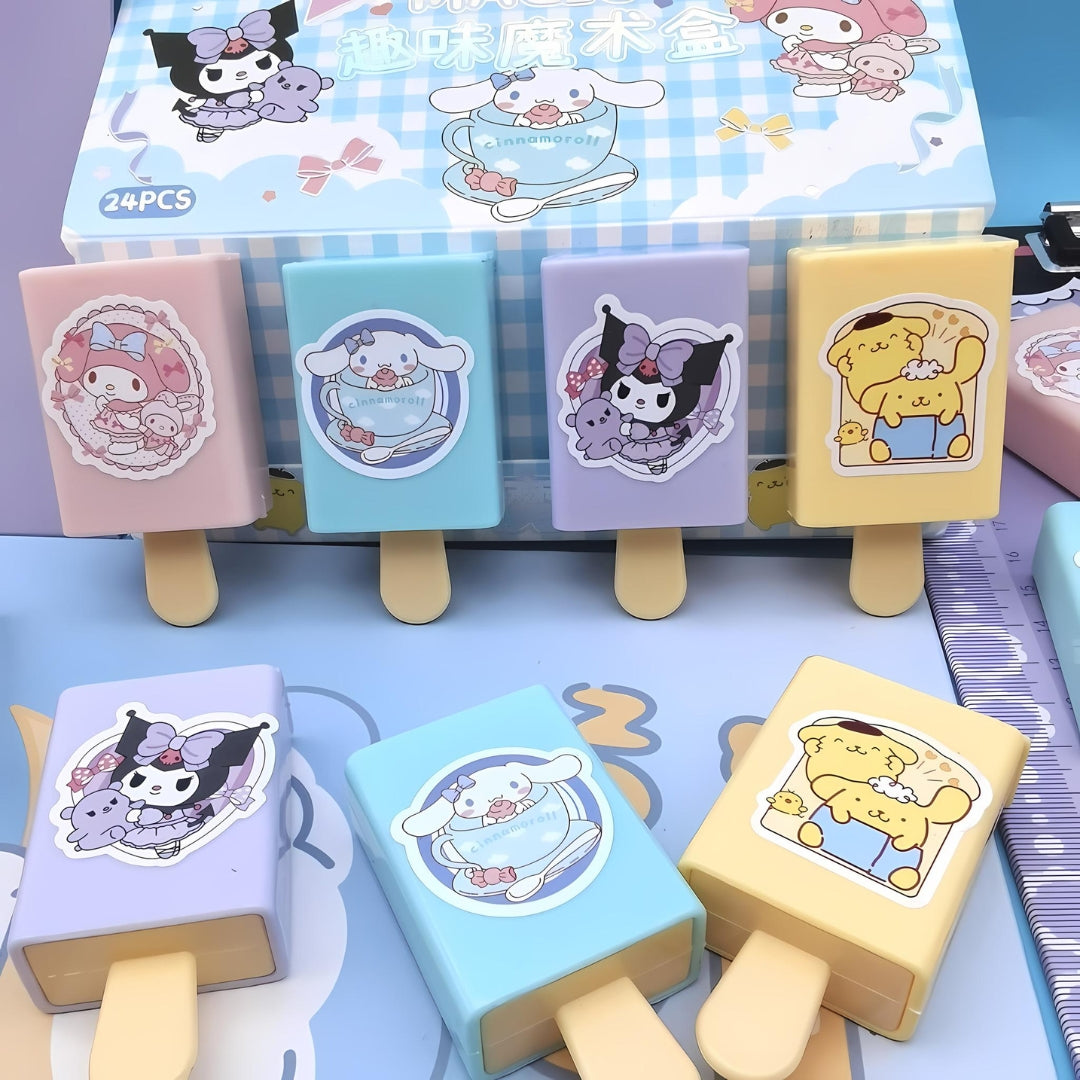 The Sanrio Magic Eraser is not just about functionality; it's about bringing joy to your everyday tasks. This magic eraser features a clever slide lock mechanism on top. Open it without sliding the lock, and the tray will come out empty without the eraser. Slide the lock slightly before pulling it out, and the eraser magically appears! A fun and interactive addition to your stationery collection, perfect for students and stationery enthusiasts. Whether you are a student gearing up for the new school session or a professional looking to add some personality to your office supplies, these erasers are the perfect choice. Their unique popsicle shape and vibrant designs make them stand out, ensuring you have stationery that speaks style. Flaunt your unique stationery in your new class or workspace and be the trendsetter amongst your peers.These erasers are also perfect for gifting, especially during the back-to-school season.