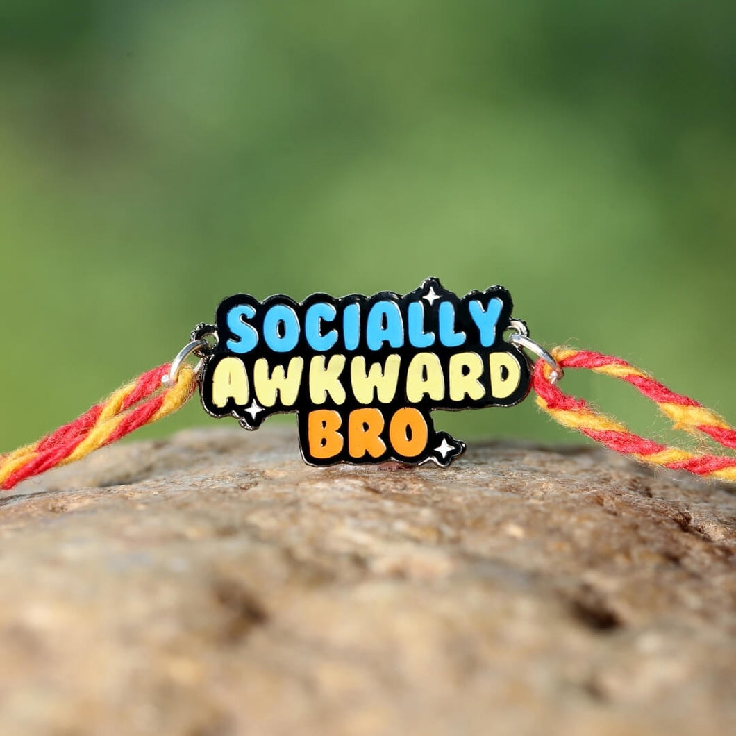 Celebrate the sibling bond with the cute and charming Socially Awkward Bro Metal Rakhi from Tinyminymo. This endearing rakhi is designed for those brothers who might feel uncomfortable or awkward in social situations. Crafted intricately from metal and paired with a high-quality thread, it exudes a cool and unique vibe that will undoubtedly make your brother feel cherished. This Raksha Bandhan, express your love and joy by tying this one of a kind rakhi, available for online purchase at Tinyminymo. Beyond being just a thread, it symbolises the exceptional connection and affection between siblings. Explore the collection of cute, adorable and unique Rakhis by shopping on Tinyminymo, your go to destination for amazing Rakhis this season. Experience the convenience of online shopping through Tinyminymo's store for an array of delightful, cute and adorable Rakhi options.