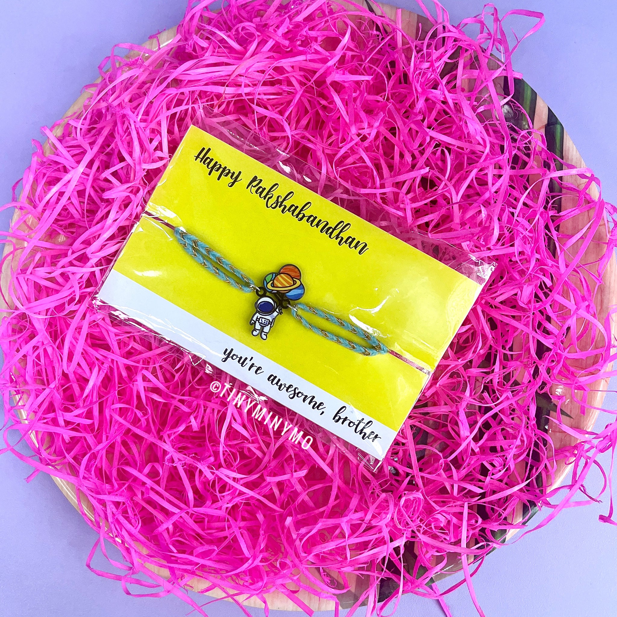 This Raksha Bandhan, take off into space with Tinyminymo's Space Metal Rakhi! This Rakhi, which is made of fine metal and has a complex, humorous space-themed pattern, is ideal for brothers who have aspirations of becoming astronauts and fascinates astronomical science . Its strong and glossy design guarantees that it is not only a magnificent memento that endures but also a symbol of your relationship. Bring some extraterrestrial charm to your festivities and let your brother show off his love for cosmos in a fashionable way. Shop online from Tinyminymo to make this Rakhi absolutely amazing!