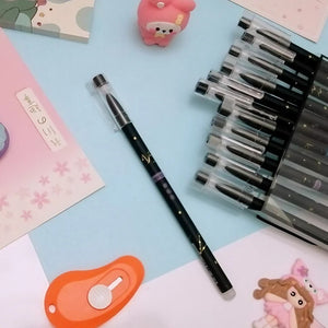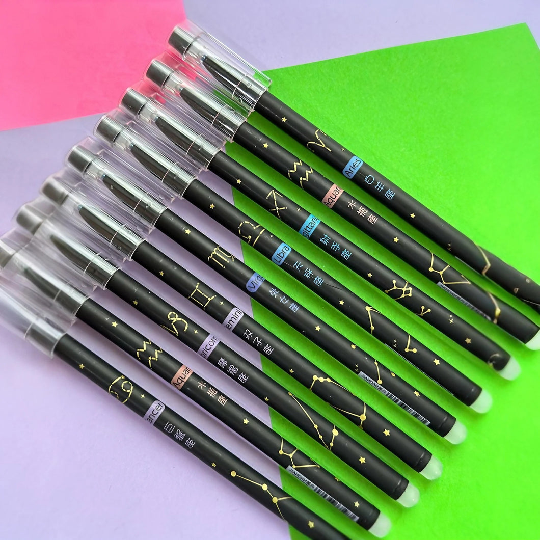 Unveiling the Twelve Constellation Gel Pen Set, a remarkable writing instrument that combines high-quality materials with a premium touch. Crafted to enhance your writing experience, this pen is a fusion of functionality and aesthetics. It boasts a unique feature - erasable ink, and it's equipped with an eraser conveniently located at the bottom of the pen. This eraser allows you to effortlessly correct any mistakes you make while writing without the worry of damaging your paper.